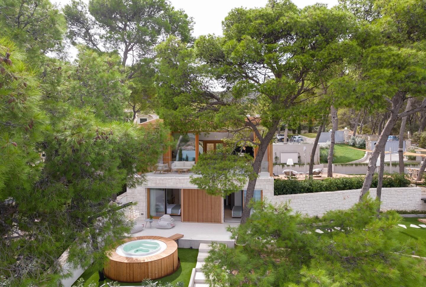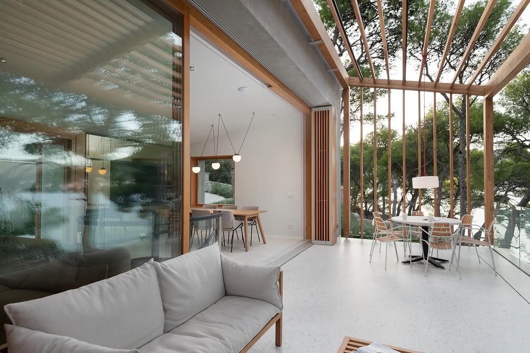 Hiša danes obsega približno 120 m² notranjega prostora, 30 m² pokrite terase in prenovljeno shrambo, ki je postala del poletne kuhinje. Posebnost projekta ni le kvadratura, ampak način, kako so prostori razporejeni po terenu in kako se arhitektura ujema z naravo.