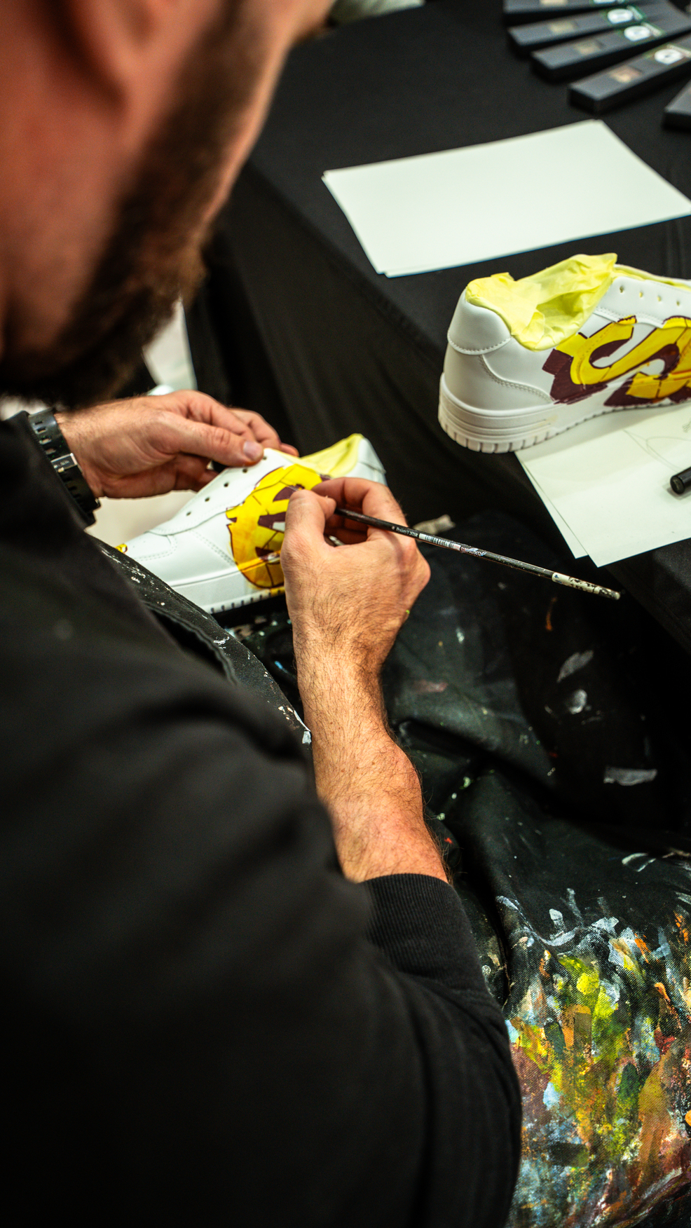 Njegovo platno postanejo nepopisane superge, ki ponujajo neskončno možnosti za interpretacijo. Obiskovalci lahko spremljajo proces nastajanja in od blizu opazujejo, kako vsak kos postopoma dobiva svojo edinstveno podobo.