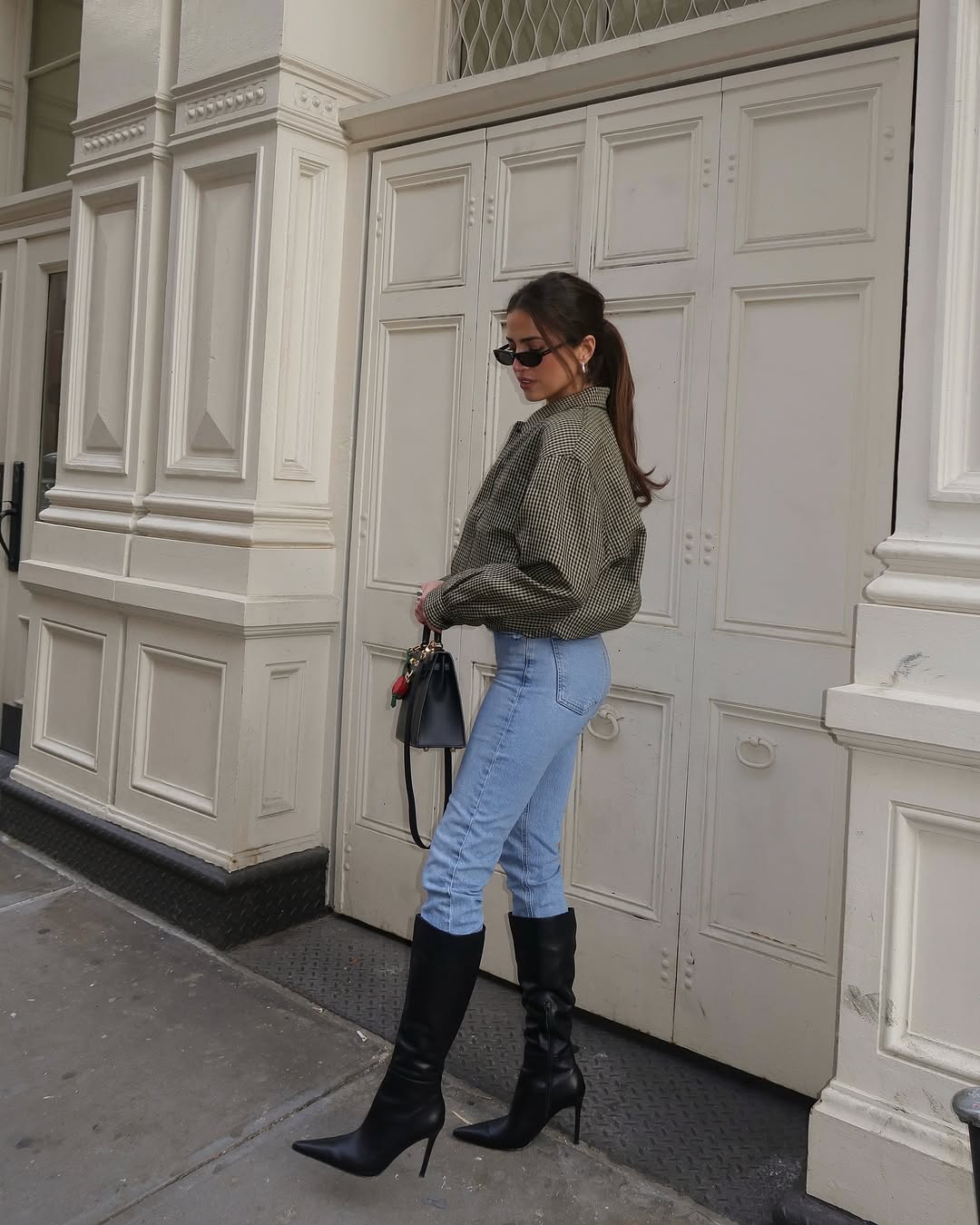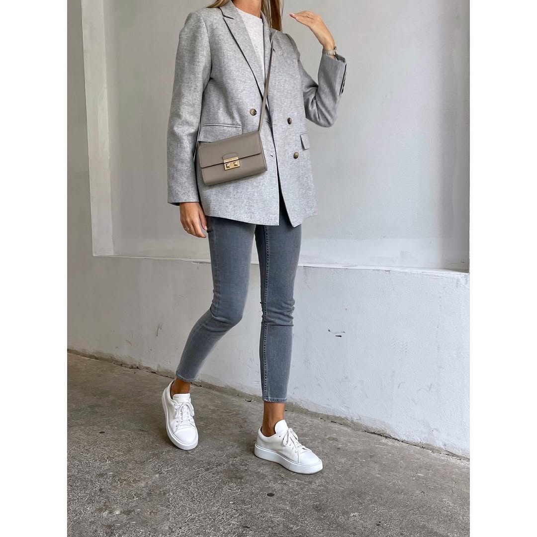 NOSITE: Preproste uhane + krajšo sivo jakno + sive oprijete kavbojke + sivo torbico + nizke čevlje
