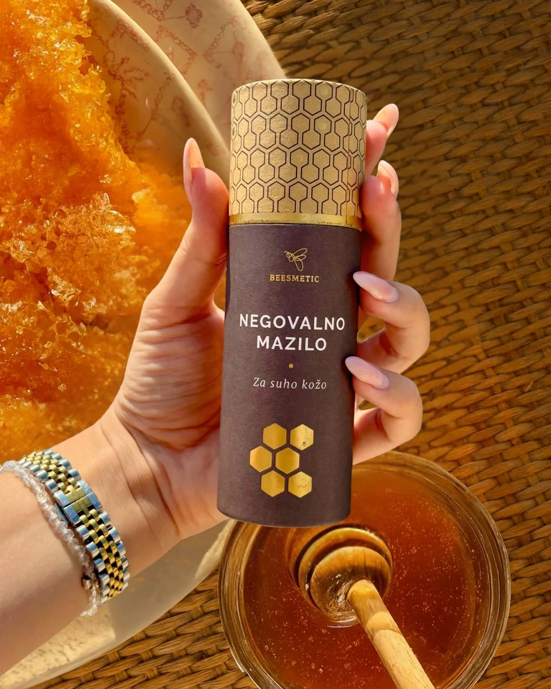 Na mojo pisalno mizo je pred časom priromal paket slovenske znamke Beesmetic. Njihovi izdelki temeljijo na naravnih sestavinah kot so med, propolis, čebelji vosek in čebelji strup. V paketu sta me čakala njihovo negovalno mazilo v stiku in krema s čebeljim strupom.