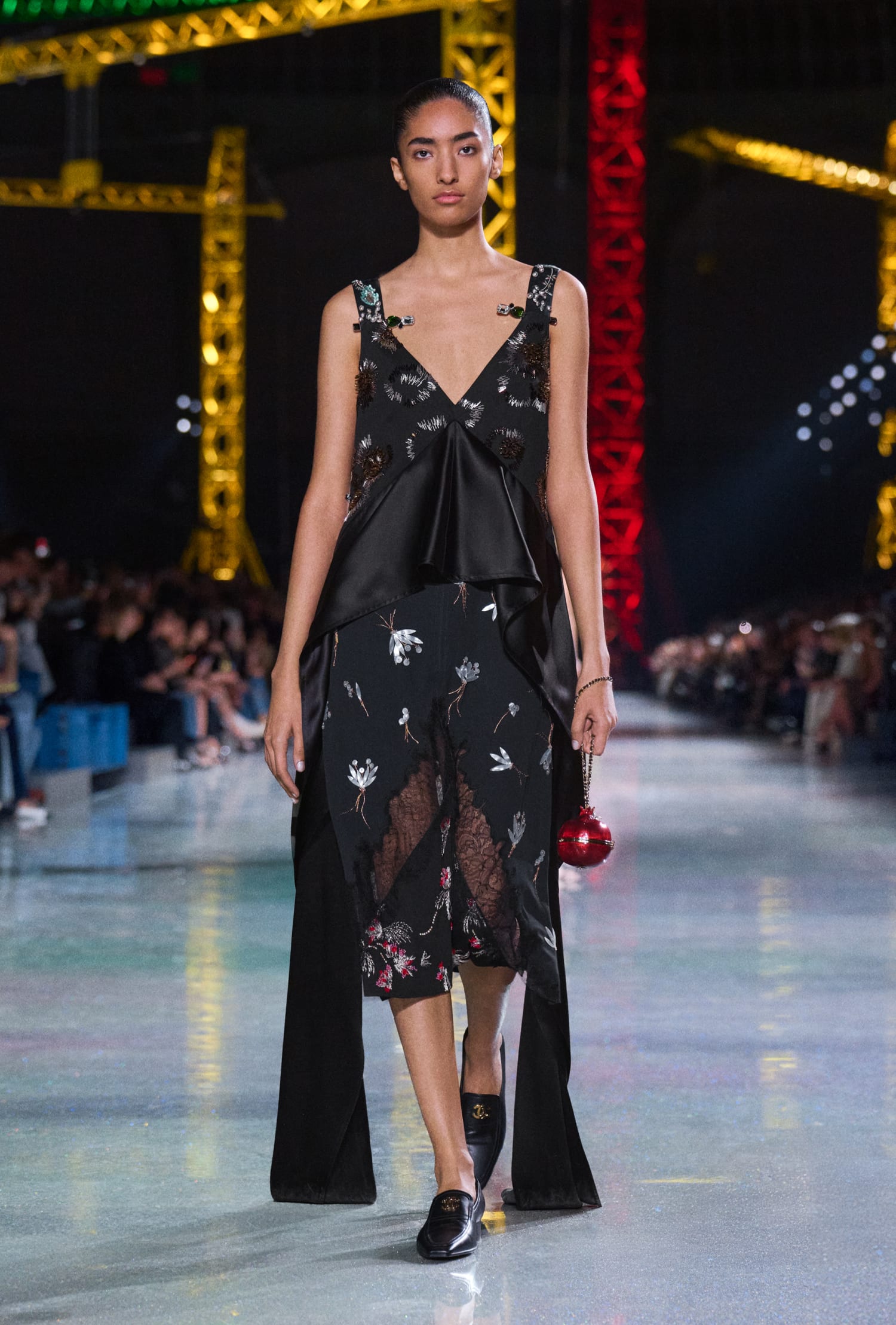 Ko se kolekcija iz dnevnih kosov premakne v večer, postanejo oblačila bolj lahkotna, sijoča in tekoča. Silhuete so elegantne, a še vedno ustvarjene za gibanje. Dialog med resničnim in umetnim, ki prežema celotno kolekcijo pa doseže vrhunec pri dodatkih.