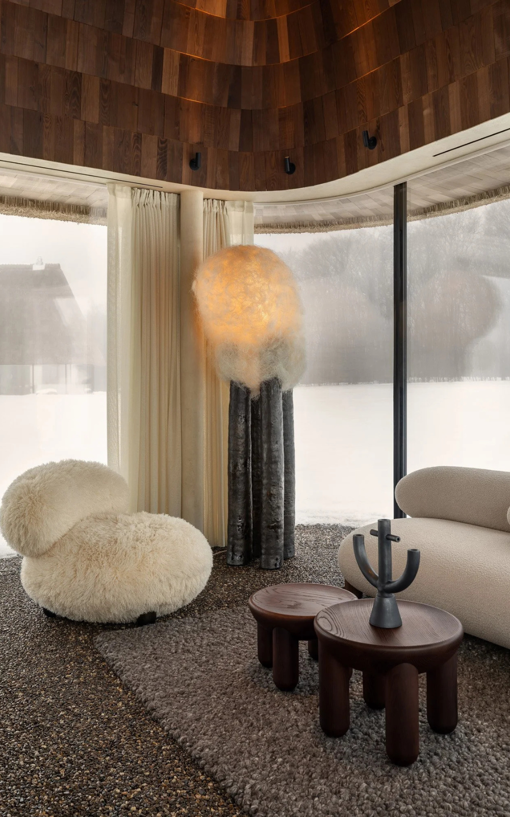Minimalistični kamin v dnevni sobi skromno spominja na tradicionalno ukrajinsko peč, medtem ko pomanjkanje televizije dodatno spodbuja mirno vzdušje, kjer se pozornost preusmeri na ogenj in spreminjajočo se naravno svetlobo.