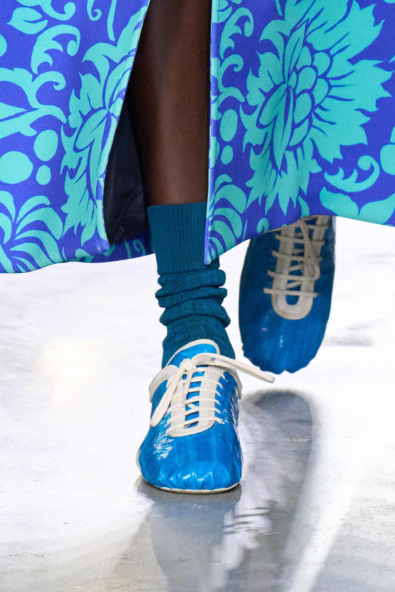 Sledi še hibridna superga, ki briše meje med klasično športno obutvijo in modnim eksperimentom. Gre za modele, ki združujejo udobje superg z nepričakovanimi silhuetami – kot so sneaker mules pri Miu Miu ali vse bolj priljubljene sneakerine.
