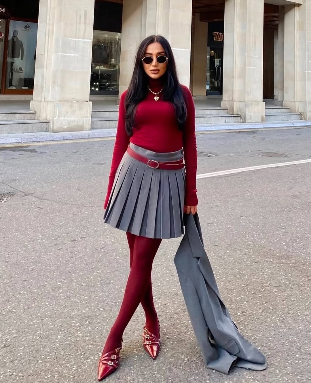 Outfit ideja z najlonkami in čevlji v bordo barvi
